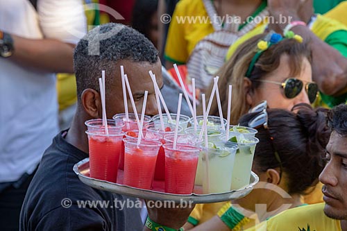 •  Detail of tray of street vendor amid the Brazilian team soccer fans - Olympic Boulevard during the match between Brazil x Belgium - World cup 2018 - game in which Brazil was eliminated  - Rio de Janeiro city - Rio de Janeiro state (RJ) - Brazil