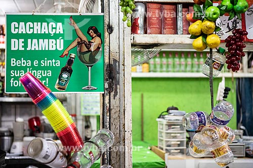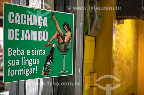 •  Detail of advertising plaque that says: Cachaca of Jambu - bar - Luiz Gonzaga Northeast Traditions Centre  - Rio de Janeiro city - Rio de Janeiro state (RJ) - Brazil