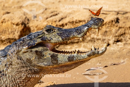 • Yacare caiman (caiman crocodilus yacare) and butterfly (Dryas iulia) - Encontro da Aguas State Park - Pocone city - Mato Grosso state (MT) - Brazil