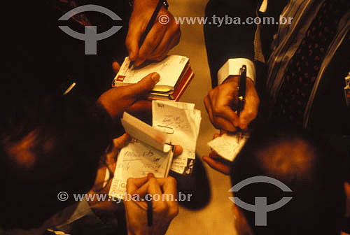 •  Economy - detail of hands of executives making calculations in small notebooks