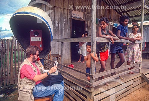•  Man using public telephone and laptop near to simple house - 90s  - Xapuri city - Acre state (AC) - Brazil