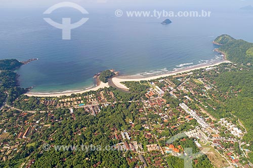 Picture taken with drone of the Camburi Beach - above - and the Camburizinho Beach - below - with the Baleia Beach in the background - Sao Sebastiao city - Sao Paulo state (SP) - Brazil