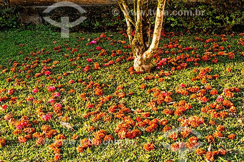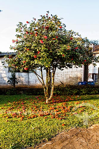 Detail of floor covered with flowers of camellia (Camellia japonica) - Treze Tilias city - Santa Catarina state (SC) - Brazil
