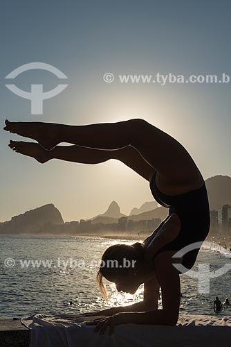•  Woman practicing Yoga - Mirante do Leme - also known as Caminho dos Pescadores (Fisherman Path) - vrschikasana movement (scorpion)  - Rio de Janeiro city - Rio de Janeiro state (RJ) - Brazil
