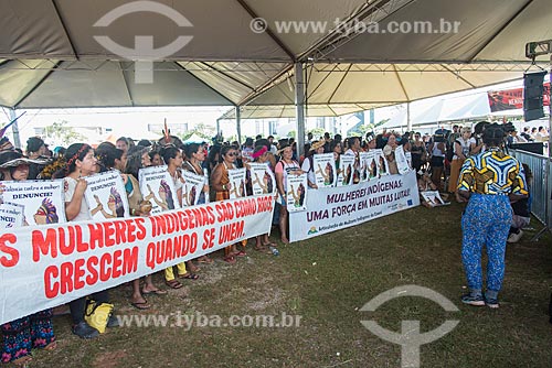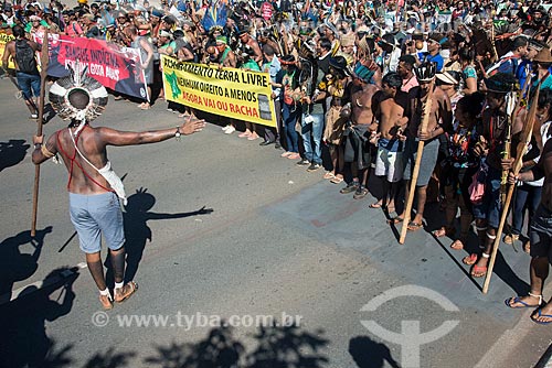 Demonstration against the municipalization of indigenous health and change from FUNAI to the Ministry of Agriculture during the 15th Free Land Camp - Esplanade of Ministries - Brasilia city - Distrito Federal (Federal District) (DF) - Brazil