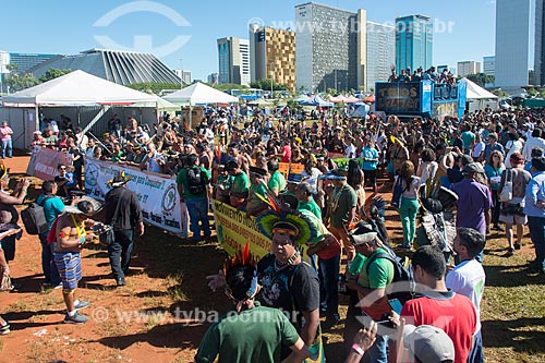 Demonstration against the municipalization of indigenous health and change from FUNAI to the Ministry of Agriculture during the 15th Free Land Camp with the Esplanade of Ministries in the background - Brasilia city - Distrito Federal (Federal District) (DF) - Brazil