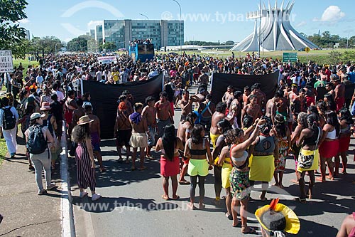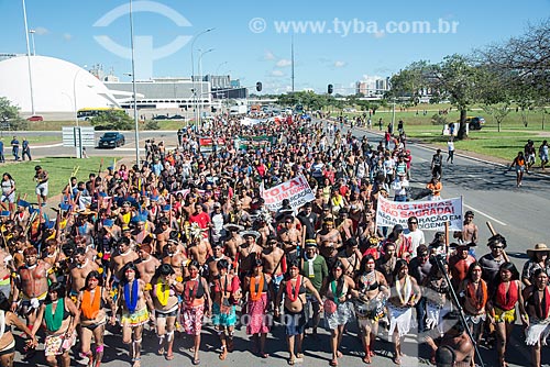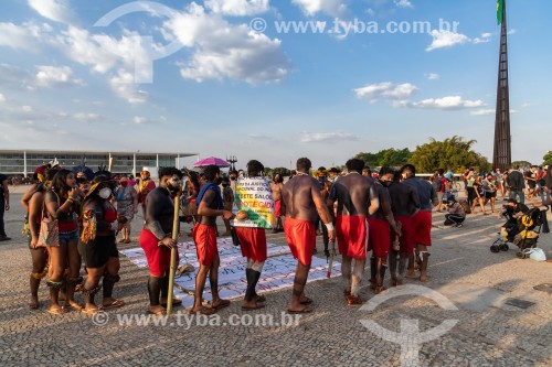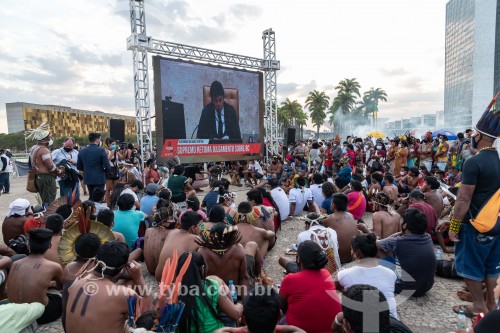 • Indigenous groups of various ethnicities camp in Brasilia promoting marches on the Esplanade of Ministries to Three Powers Square where they protest against the time frame, in a process at the Federal Supreme Court - headquarters of the Judiciary (STF) - Brasilia city - Distrito Federal (Federal District) (DF) - Brazil