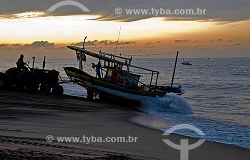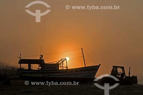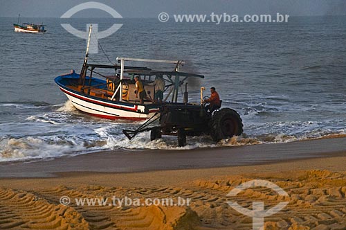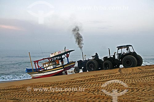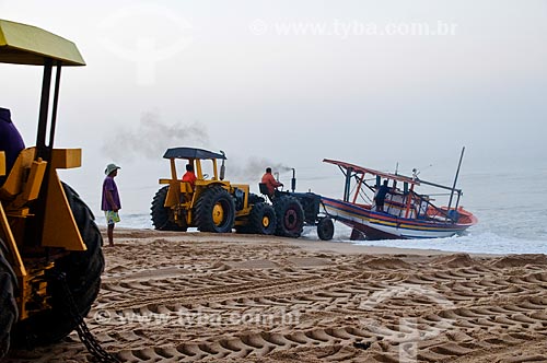 Subject: Tractor by pulling fishing boat to the sand on the beach of Farol de Sao Thome - Fishermen by using tractors to pull and push boats the sea to the sand, because not possess the docking port for boats / Place: Farol de Sao Thome neighborhood