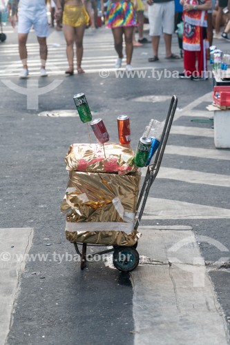 Display with beer cans of beverage street vendors - during Fogo e Paixao carnival street troup parade - Rio de Janeiro city - Rio de Janeiro state (RJ) - Brazil