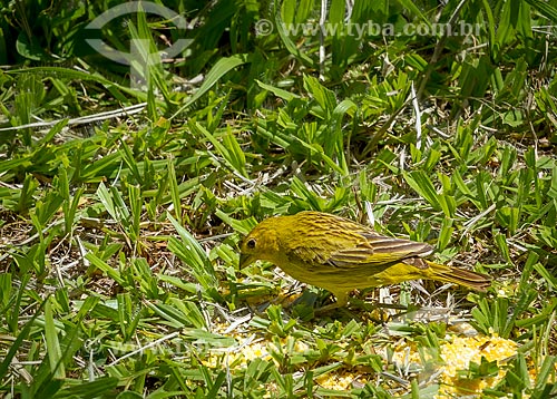 •  Detail of saffron finch (Sicalis flaveola) - also known as Canario de tejado - feeding of canjiquinha  - Guarani city - Minas Gerais state (MG) - Brazil