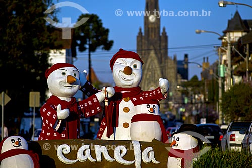 •  Detail of winter decoration with the Nossa Senhora de Lourdes Church - also know as Catedral de Pedra (Cathedral of Stone) - in the background  - Canela city - Rio Grande do Sul state (RS) - Brazil