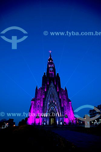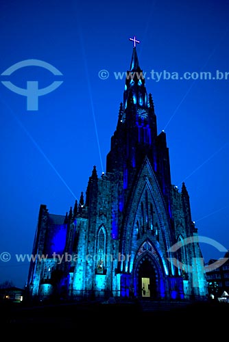 View of the Nossa Senhora de Lourdes Church - also know as Catedral de Pedra (Cathedral of Stone) - with special lighting during the nightfall - Canela city - Rio Grande do Sul state (RS) - Brazil
