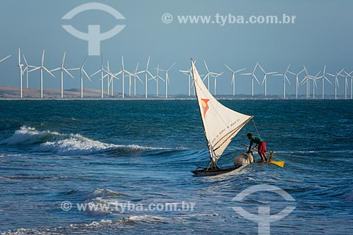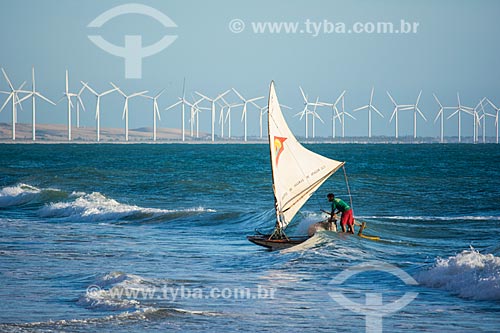 •  fisherman in raft - Canoa Quebrada Beach with the Canoa Quebrada Wind Farm in the background  - Aracati city - Ceara state (CE) - Brazil
