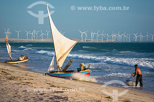 fisherman in raft - Canoa Quebrada Beach with the Canoa Quebrada Wind Farm in the background - Aracati city - Ceara state (CE) - Brazil