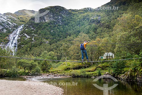 •  Tourist crossing the bridge over the river on track in Fort William city - near to Glen coe village region  - Fort William - Highland - Scotland