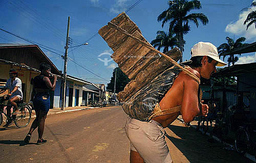 •  (Hevea brasiliensis) Rubber tappers in Xapuri village (Chico Mendes village) taking the manual processed to market - Xapuri city - Acre state - Brazil