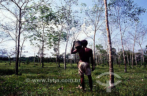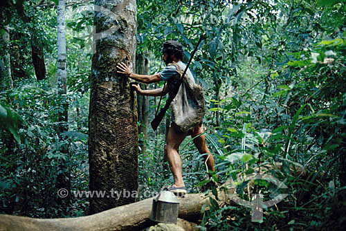 •  (Hevea brasiliensis) Rubber tapper working in the rubber tapping community of Cachoeira in the city of Xapuri - Acre state - Brazil
