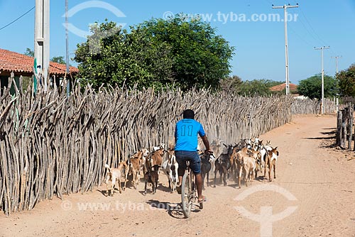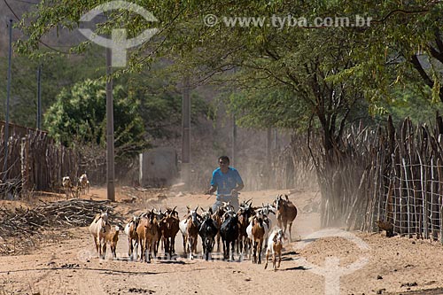 •  Man herding goats raising (Capra aegagrus hircus) at bike - Travessao de Ouro Village - Pipipas tribe  - Floresta city - Pernambuco state (PE) - Brazil