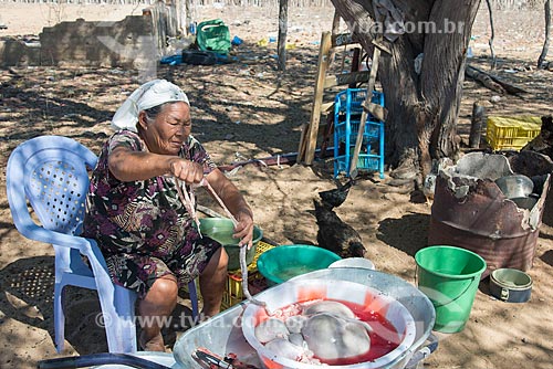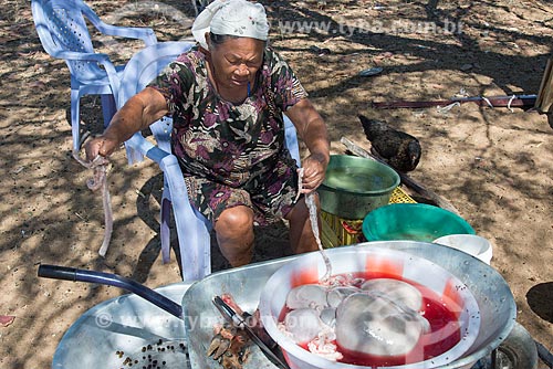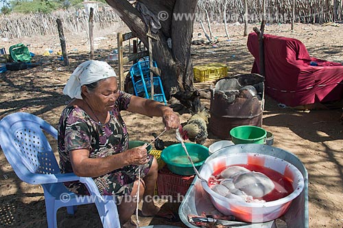 Elderly woman clearing parts of goat - Travessao de Ouro Village - Pipipas tribe - Floresta city - Pernambuco state (PE) - Brazil