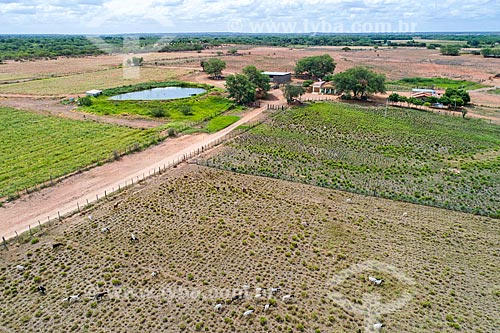 Picture taken with drone of the farm with goat (Capra aegagrus hircus) in the pasture - Cabrobo city - Pernambuco state (PE) - Brazil