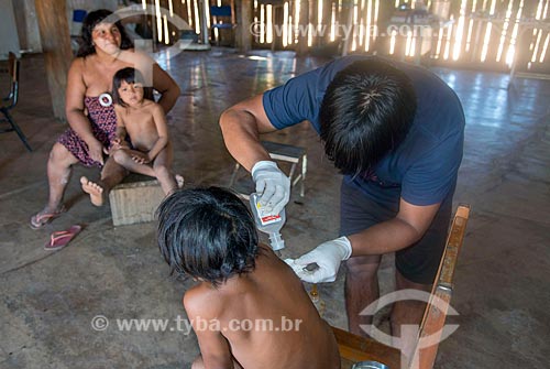 Boy receiving medical care at the health post - Aiha village of the Kalapalo tribe - INCREASE OF 100% OF THE VALUE OF TABLE - Querencia city - Mato Grosso state (MT) - Brazil