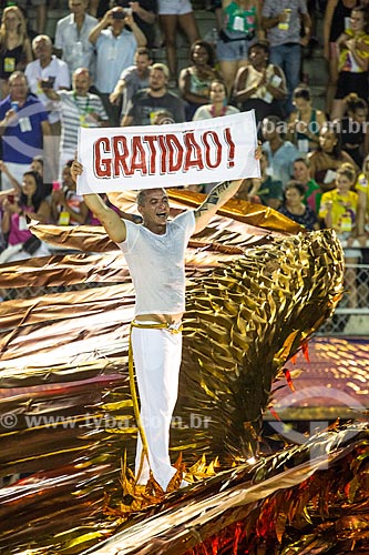 Parade of Gremio Recreativo Escola de Samba Unidos do Viradouro Samba School - Paulo Barros carnival planner in highlight of floats holding poster that say: Gratidao (Gratitude) - Plot in 2019 - Viraviradouro! (Turns Viradouro!) - Rio de Janeiro city - Rio de Janeiro state (RJ) - Brazil