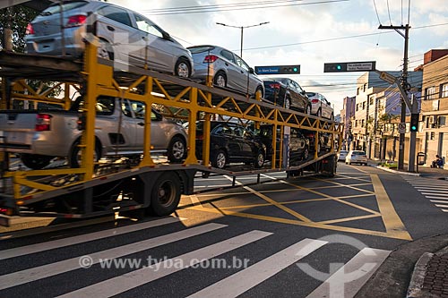 Car carrier truck - Goias Avenue - near to automaker factory of General Motors Corporation - Sao Caetano do Sul city - Sao Paulo state (SP) - Brazil