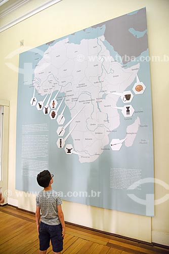 Boy observing exhibition Africa - past and present - on exhibit - National Museum - old Sao Cristovao Palace - Rio de Janeiro city - Rio de Janeiro state (RJ) - Brazil