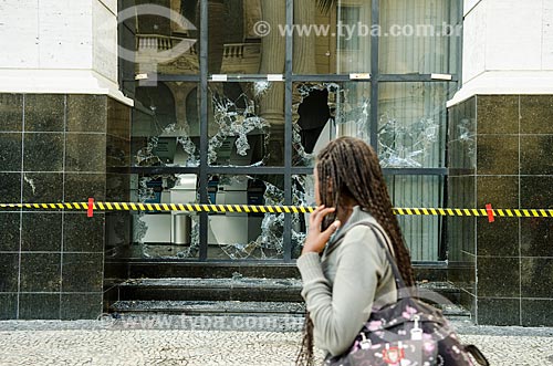 •  Subject: Woman passing in front of the bank branch of the Bank of Brazil in 13 de Maio Avenue vandalized after demonstrations in the city center / Place: City center neighborhood - Rio de Janeiro city - Rio de Janeiro state (RJ) - Brazil / Date: 10/