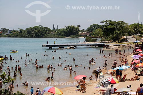 Bathers - Prainha Beach with ruins of bridge that which linked Tamoios (Cabo Frio) and Barra de Sao Joao (Casimiro de Abreu) districts - Casimiro de Abreu city - Rio de Janeiro state (RJ) - Brazil