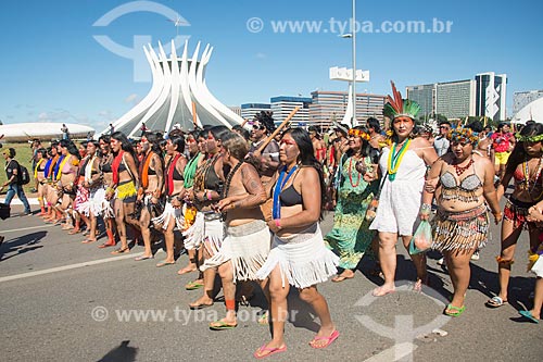 Demonstration against the municipalization of indigenous health and change from FUNAI to the Ministry of Agriculture during the 15th Free Land Camp with the Cathedral of Brasilia in the background - Brasilia city - Distrito Federal (Federal District) (DF) - Brazil