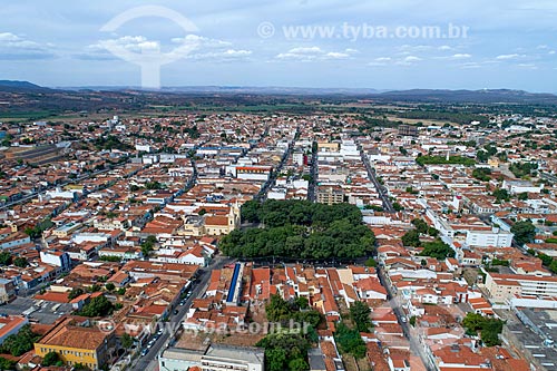 • Picture taken with drone of the city center and the Nossa Senhora da Penha Mother Church - Se Square - Chapada do Araripe in the background - Crato city - Ceara state (CE) - Brazil