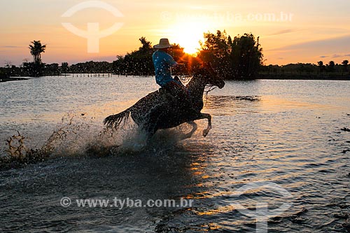 Cattle herding and horses - dam near to of the Sanjo Farm during the sunset - Salvaterra city - Para state (PA) - Brazil