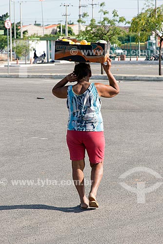 Woman carrying discarded fruit on the head - Centrals of Supply of Ceara State S.A. - CEASA do Cariri - Barbalha city - Ceara state (CE) - Brazil