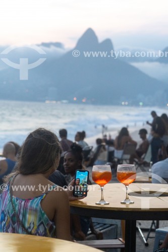 People at bar table using smartphone at dusk on Arpoador beach with Two Brothers Mountain in the background - Rio de Janeiro city - Rio de Janeiro state (RJ) - Brazil