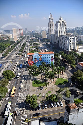 Graffiti called short stories - Rivadavia Correa Municipal School - part of the Projeto Rio Big Walls - to the left - with the Central do Brasil Train Station and Duque de Caxias Palace (1941) in the background - Rio de Janeiro city - Rio de Janeiro state (RJ) - Brazil