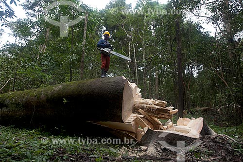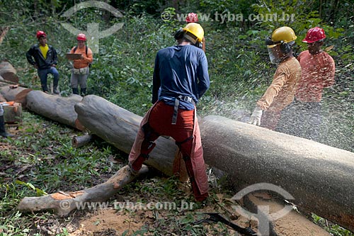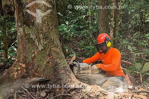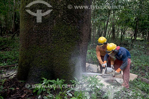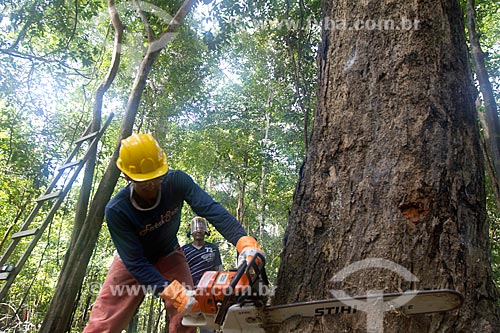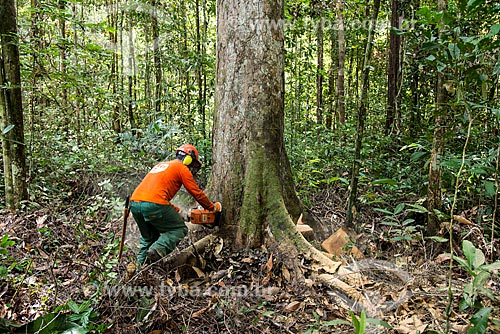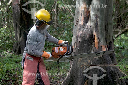 •  Worker of Tropical Forest Institute (IFT) cutting tree - Roberto Bauch Center of Forestry  - Paragominas city - Para state (PA) - Brazil