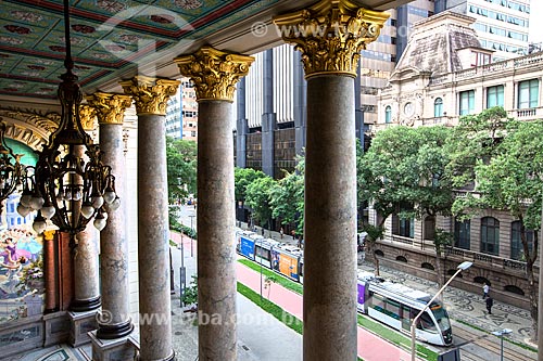 View of the light rail transit transiting on Passeio Publico of Rio Branco Avenue from side veranda of the Municipal Theater of Rio de Janeiro to the right - Rio de Janeiro city - Rio de Janeiro state (RJ) - Brazil