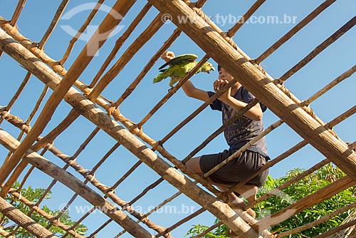 •  Indigenous boy playing with parrot during work - cover of the hut with thatch - Aiha village of the Kalapalo tribe - INCREASE OF 100% OF THE VALUE OF TABLE  - Querencia city - Mato Grosso state (MT) - Brazil