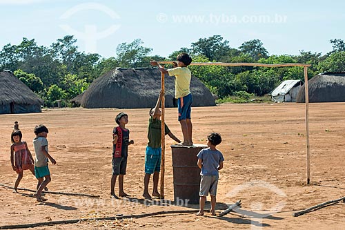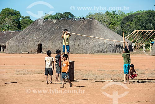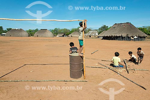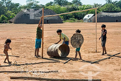 •  Indigenous boys mounting goalpost for soccer field - Aiha village of the Kalapalo tribe - INCREASE OF 100% OF THE VALUE OF TABLE  - Querencia city - Mato Grosso state (MT) - Brazil
