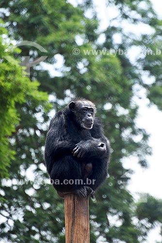 •  Common Chimpanzee (Pan troglodytes) on top of a wooden pole - Rio de Janeiro Zoo  - Rio de Janeiro city - Rio de Janeiro state (RJ) - Brazil