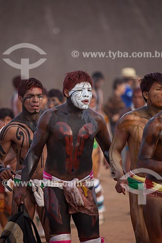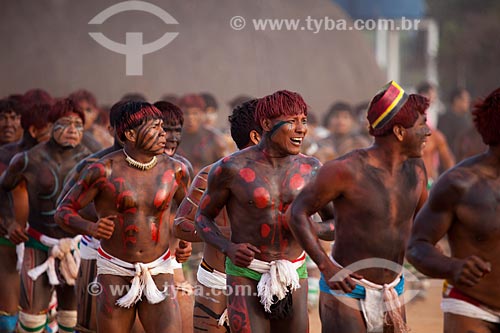 •  Indians run in circles in preparation for the Huka Huka, a kind of fighting of the Kuarup  ritual - this years ceremony in honor of the anthropologist Darcy Ribeiro - Photo Licensed (Released 94) - INCREASE OF 100% OF THE VALUE OF TABLE  - Gaucha do Norte city - Mato Grosso state (MT) - Brazil