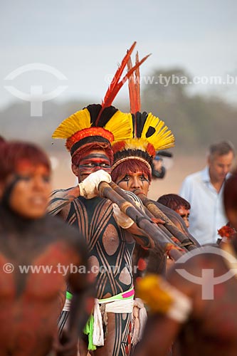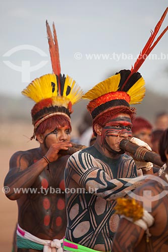•  Indians run in circles and playing the urua flute in preparation for the Huka Huka, a kind of fighting of the Kuarup  ritual - this years ceremony in honor of the anthropologist Darcy Ribeiro - Photo Licensed (Released 94) - INCREASE OF 100% OF THE   - Gaucha do Norte city - Mato Grosso state (MT) - Brazil