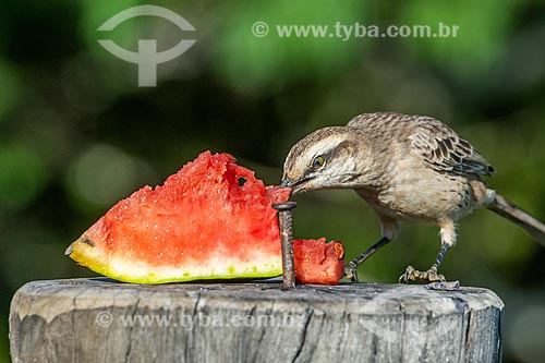 •  Detail of chalk-browed mockingbird (Mimus saturninus) eating watermelon - Veadeiros Plateau  - Alto Paraiso de Goias city - Goias state (GO) - Brazil