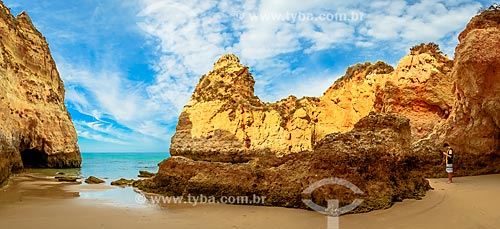 Couple passing between the crevice of rock - Alvor Beach - Portimao municipality - Faro district - Portugal