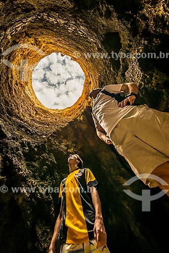 Men observing the hole inside of rock - Prainha Beach - Alvor civil parish - Portimao municipality - Faro district - Portugal
