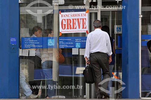 Subject: Caixa Econômica Federal agency with posters with the words Banking on strike / Place: Sao Jose do Rio Preto city - Sao Paulo state (SP) - Brazil / Date: 09/2013