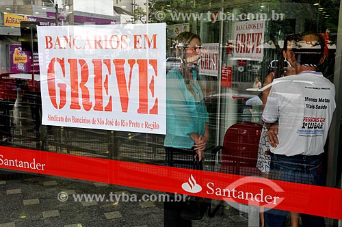 Subject: Santander bank agency with posters with the words Banking on strike / Place: Sao Jose do Rio Preto city - Sao Paulo state (SP) - Brazil / Date: 09/2013