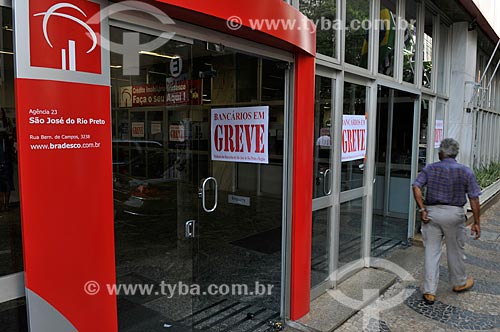 Subject: Bradesco bank agency with posters with the words Banking on strike / Place: Sao Jose do Rio Preto city - Sao Paulo state (SP) - Brazil / Date: 09/2013