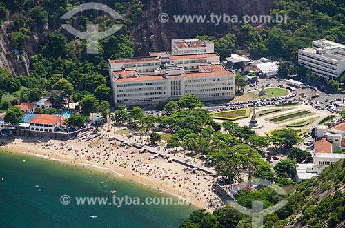 Aerial photo of Vermelha Beach (Red Beach) with Praia Vermelha Military Circle, Military Institute of Engineering and Naval War College - from the left to right - with buildings of Botafogo neighborhood in the background - Rio de Janeiro city - Rio de Janeiro state (RJ) - Brazil